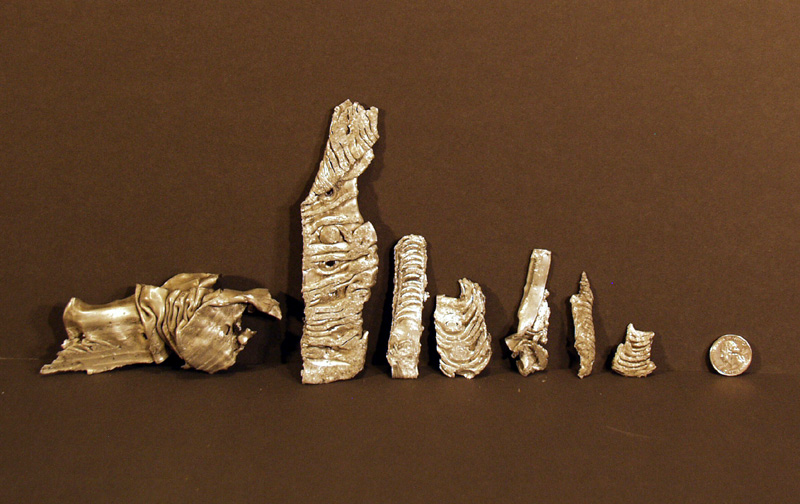 Each of these pieces has a different shape but the folding up of the metal as if it were cloth is typical.